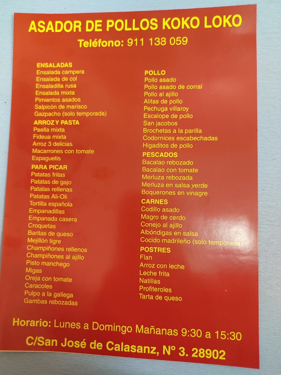 El Asador de pollos KOKO LOKO es un establecimiento ideal para comprar comida para llevar, dado que tienen multitud de platos preparados, tanto entrantes, como primeros o segundos, además de ricos postres, todo casero, rico y recomendable.